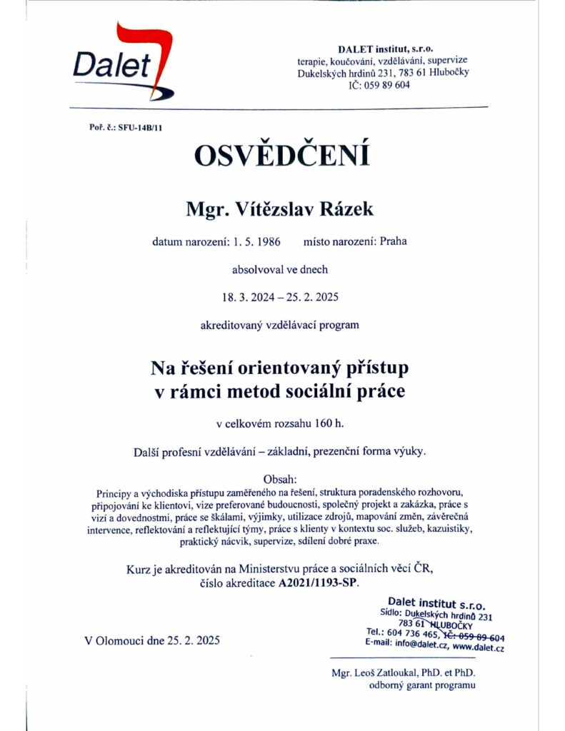 2024 – nyní – metody Terapie orientované na řešení, Kids Skills, Individuální terapie, Párová a skupinová terapie.